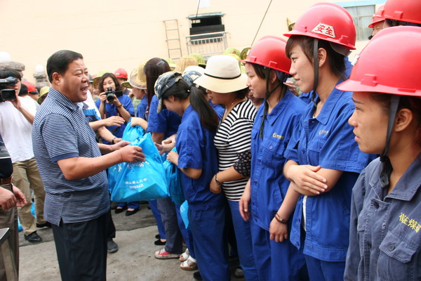 在生产一线,顾军与职工一一握手,并代表县总工会对广大职工表示亲切的慰问,提醒大家注意做好防暑工作。此次“送清凉”活动,为广大职工带来了防暑用品,极大的鼓舞了一线职工的工作热情。