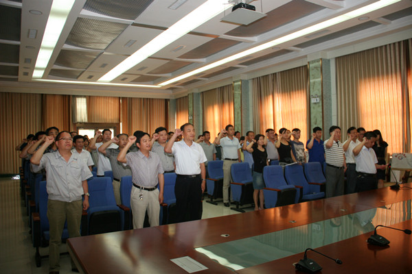 宣誓仪式在雄壮的《国际歌》声中拉开帷幕,全体人员起立,随着旋律纵声高唱。随后,与会全体党员在矿长余进荣的带领下,面对党旗,举起握拳的右手,进行了庄严宣誓,重温了入党誓词。
