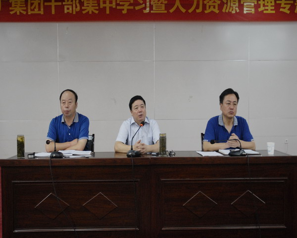集团公司党委书记、董事长张长宏(中),党委副书记、监事会主席路明文(右),党委副书记、总经理贾凤君(左)分别作大会讲话