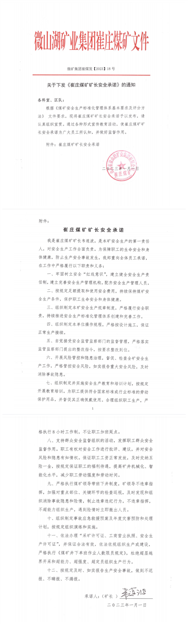 崔庄煤矿矿长安全承诺书