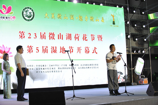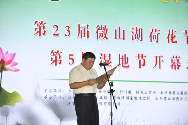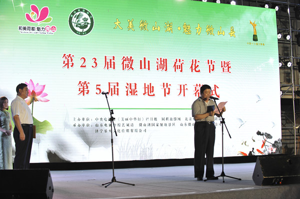 中央电视台美丽中华行栏目主编林晖代表中央电视台美丽中华行栏目对第二十三届微山湖荷花节暨第五届湿地节的开幕表示热烈的祝贺!林晖指出,微山县钟灵毓秀,人文荟萃。微山湖是国家4A级旅游景区,山东省首批风景名胜区和省级生态功能保护区,也是省级旅游度假区;湖内物产富饶,有鱼类78种、水生经济植物103种、鸟类209种,素有“日出斗金”之美誉。中华始祖伏羲、宋国始祖微子、春秋君子目夷、汉代名相张良等都曾在微山生活过,留下了众多珍贵文化遗产和古迹。运河文化、梁祝文化、微山湖文化源远流长,形成了南北交汇相融的渔乡风情。铁道游击队的英雄们谱写的一曲曲可歌可泣的英雄事迹,更是让微山的红色文化蜚声中外。微山湖国家湿地公园,是亚洲最大的草甸型湖泊湿地,2013年荣膺“中国十大魅力湿地”荣誉称号。