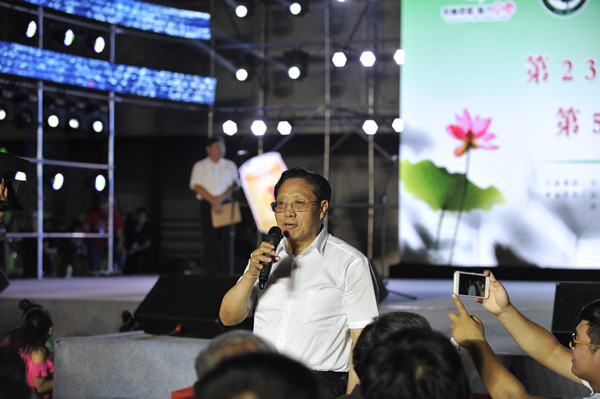 在全场欢呼声中,国家外交部原副部长、中国前外交官联谊会会长、宋庆龄基金会副主席吉佩定宣布2016年第二十三届微山湖荷花节暨第五届湿地节开幕。