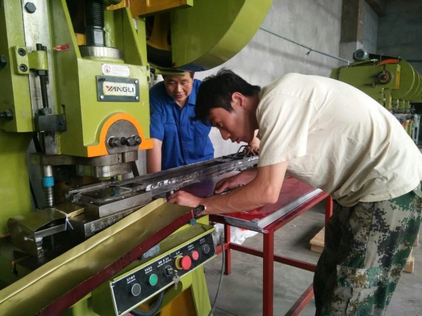 为了保证彩印公司铁盒生产车间尽快投入生产,精密制造公司接到三产部的任务安排后,立即组织有关技术人员赶赴现场实地考察,了解工作流程,对每一个细节都认真排查。并指派专门的技术人员,协助彩印公司对铁盒加工设备存在的不足进行革新改造。工作中,维修人员排查发现在冲压最后一个盒盖时,因操作者的手必须置于模具下方才能定位,容易因操作引起安全事故,不利于安全生产。对此,我公司技术人员经过摸索,精心制作,拆除了厂家的定位装置,改变了原来的出料方式,以最短的时间制造出样机,改手动送料为机器半自动送料,进行安装调试。安装调试好后,又采取现场演示和耐心讲解,让彩印公司设备操作人员尽快熟悉操作流程掌握此装置的使用方法。