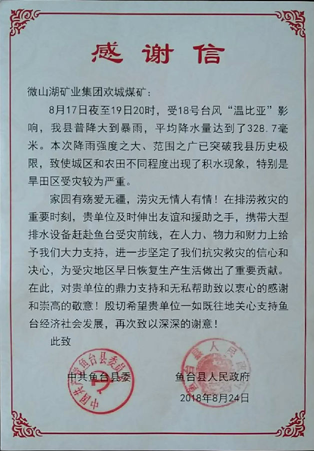 信中说,8月17日至19日,鱼台县普降大到暴雨,降雨范围之广,雨量之大,突破历史极限。在排涝救灾的重要时刻,欢城煤矿紧急行动,无私支援,第一时间组织了人员、设备和物资,赶赴受灾前线,参加救灾战斗。